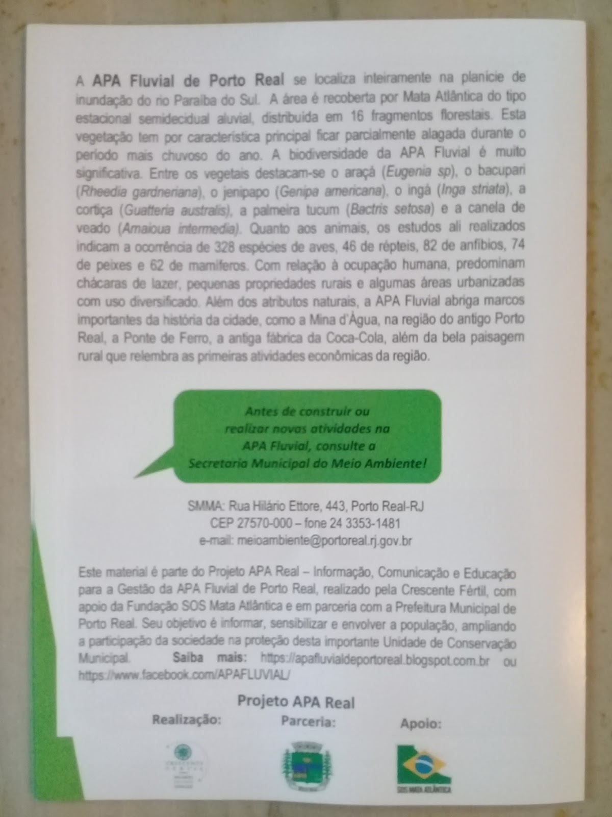Foram disponibilizados cartazes para dar continuidade à divulgação da APA junto à população. Uma equipe da secretaria do Meio Ambiente e do projeto APA Real percorreu algumas instituições públicas do município para a fixação dos mesmos em locais de fácil visualização.